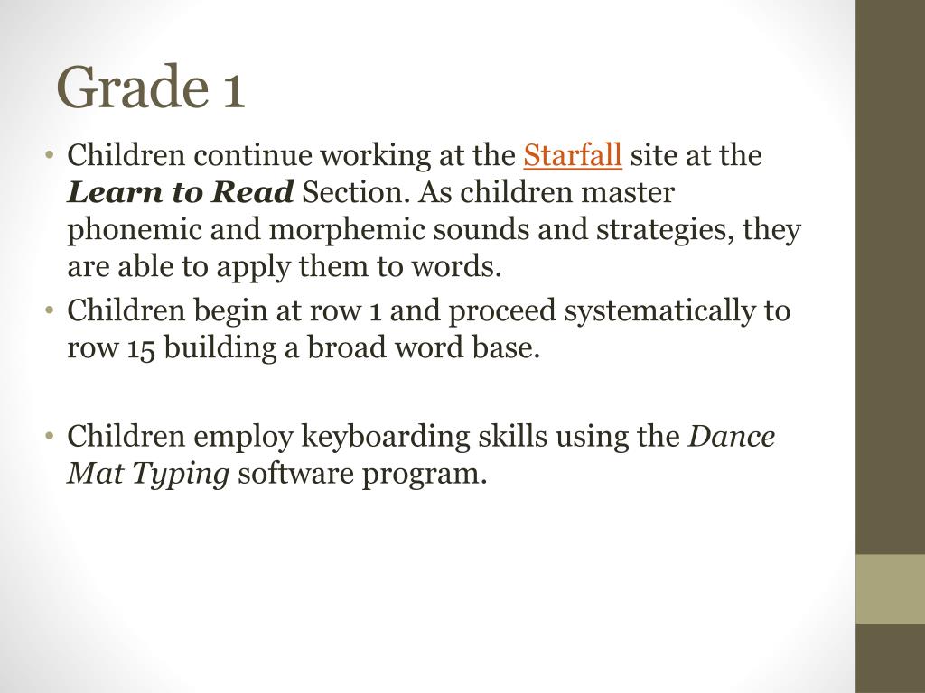 Grade 1 • Children continue working at the Starfallsite at the Learn to Read Section. As children master phonemic and morphemic sounds and strategies, they are able to apply them to words. • Children begin at row 1 and proceed systematically to row 15building a broad word base. • Children employ keyboarding skills using the Dance Mat Typing software program.
