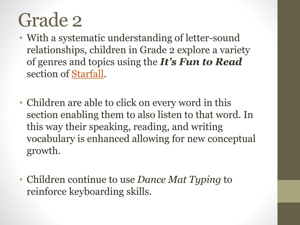 Grade 2 • With a systematic understanding of letter-sound relationships, children in Grade 2 explore a variety of genres and topics using the It’s Fun to Read section of Starfall. • Children are able to click on every word in this section enabling them to also listen to that word. In this way their speaking, reading, and writing vocabulary is enhanced allowing for new conceptual growth. • Children continue to use Dance Mat Typing to reinforce keyboarding skills.