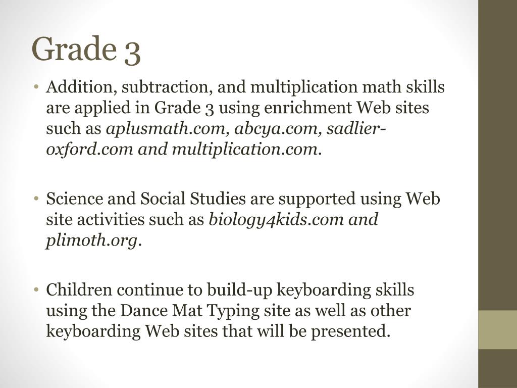 Grade 3 • Addition, subtraction, and multiplication math skills are applied in Grade 3 using enrichment Web sites such as aplusmath.com, abcya.com, sadlier-oxford.com and multiplication.com. • Science and Social Studies are supported using Web site activities such as biology4kids.com and plimoth.org. • Children continue to build-up keyboarding skills using the Dance Mat Typing site as well as other keyboarding Web sites that will be presented.