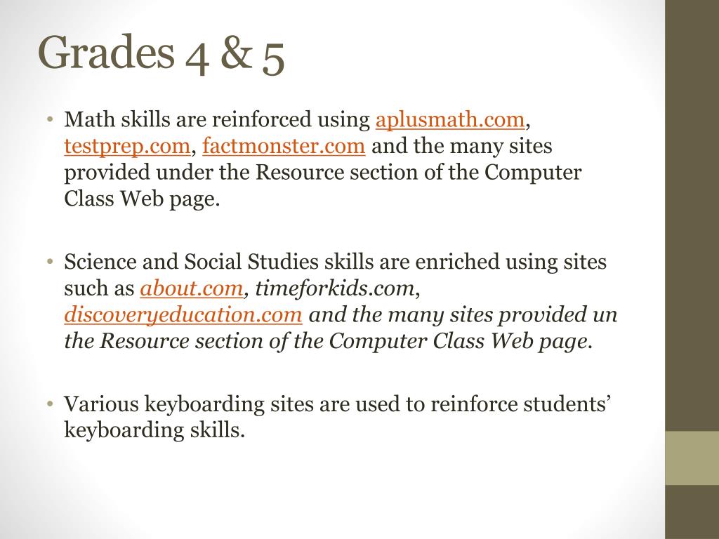 Grades 4 & 5 • Math skills are reinforced using aplusmath.com, testprep.com, factmonster.com and the many sites provided under the Resource section of the Computer Class Web page. • Science and Social Studies skills are enriched using sites such as about.com, timeforkids.com, discoveryeducation.com and the many sites provided un the Resource section of the Computer Class Web page. • Various keyboarding sites are used to reinforce students’ keyboarding skills.