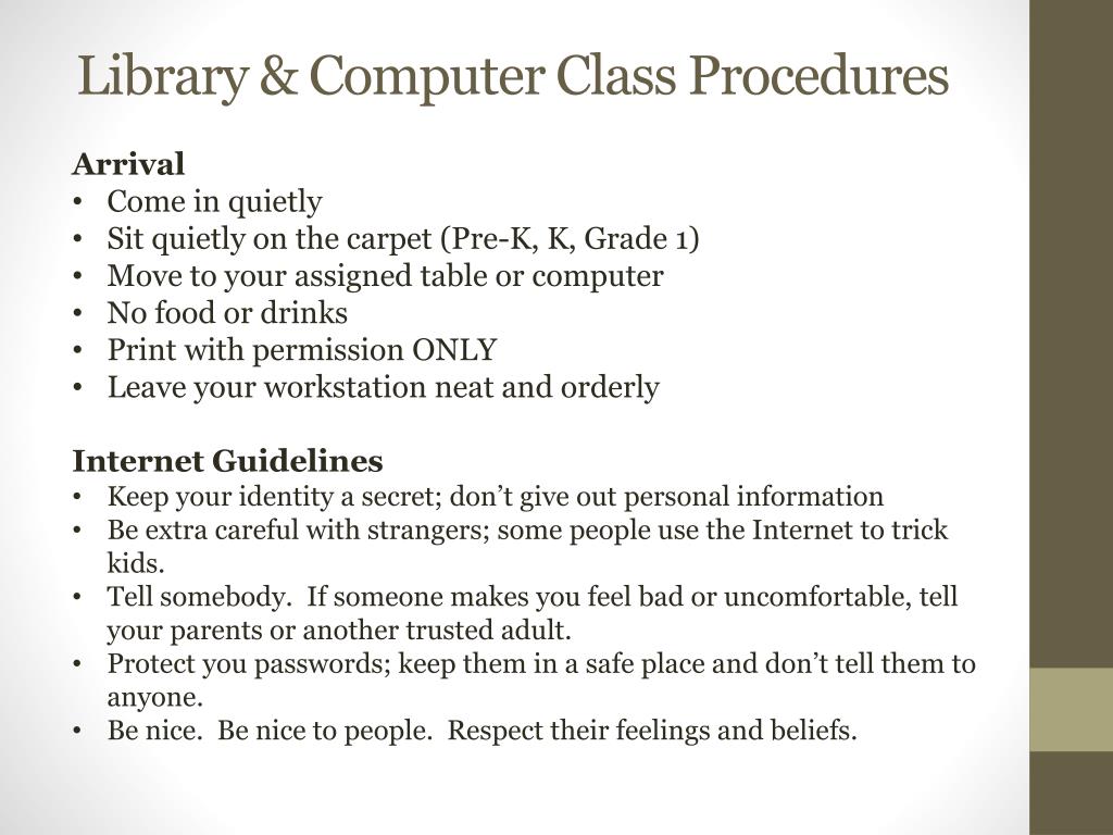Library & Computer Class Procedures • Arrival • Come in quietly • Sit quietly on the carpet (Pre-K, K, Grade 1) • Move to your assigned table or computer • No food or drinks • Print with permission ONLY • Leave your workstation neat and orderly • Internet Guidelines • Keep your identity a secret; don’t give out personal information • Be extra careful with strangers; some people use the Internet to trick kids. • Tell somebody. If someone makes you feel bad or uncomfortable, tell your parents or another trusted adult. • Protect you passwords; keep them in a safe place and don’t tell them to anyone. • Be nice. Be nice to people. Respect their feelings and beliefs.
