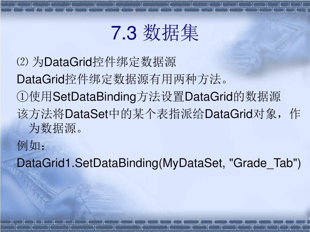 7.3 数据集 ⑵ 为DataGrid控件绑定数据源 DataGrid控件绑定数据源有用两种方法。 ①使用SetDataBinding方法设置DataGrid的数据源 该方法将DataSet中的某个表指派给DataGrid对象,作为数据源。 例如: DataGrid1.SetDataBinding(MyDataSet, "Grade_Tab")