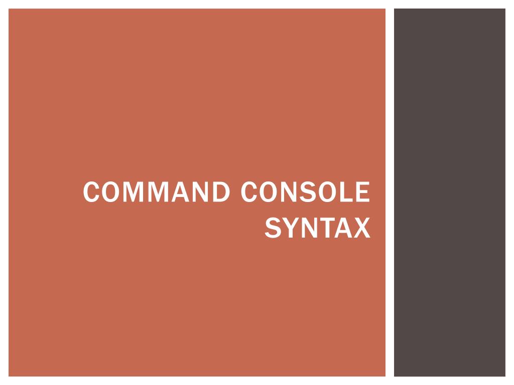 Console syntax pt2 • conc – clears the console. • cont<[string]>- sets the console title. • con_col<[colour id]>- sets the console colour, the list of colours are as follows; (you can type the name or the number of the colour as the id) • TX_NAVY=1 • TX_GREEN=2 • TX_DARKCYAN=3 • TX_DARKRED=4 • TX_DARKFUCSHIA=5 • TX_DARKYELLOW=6 • TX_SILVER=7 • TX_GRAY=8 • TX_BLUE=9 • TX_LIME=10 • TX_CYAN=11 • TX_RED=12 • TX_FUCHSIA=13