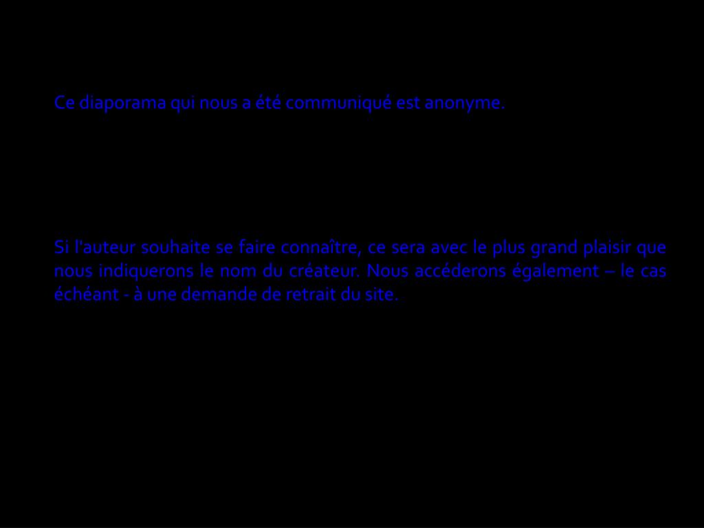 Ce diaporama qui nous a été communiqué est anonyme. Si l'auteur souhaite se faire connaître, ce sera avec le plus grand plaisir que nous indiquerons le nom du créateur. Nous accéderons également – le cas échéant - à une demande de retrait du site.