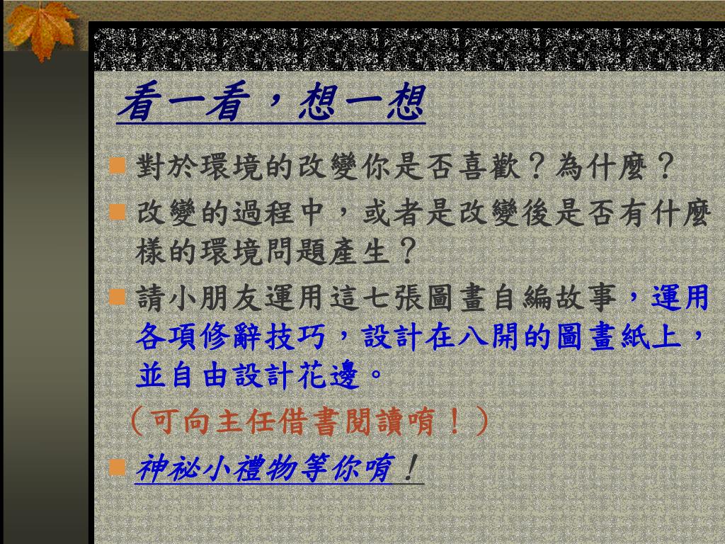 看一看,想一想 • 對於環境的改變你是否喜歡?為什麼? • 改變的過程中,或者是改變後是否有什麼樣的環境問題產生? • 請小朋友運用這七張圖畫自編故事,運用各項修辭技巧,設計在八開的圖畫紙上,並自由設計花邊。 (可向主任借書閱讀唷!) • 神祕小禮物等你唷!