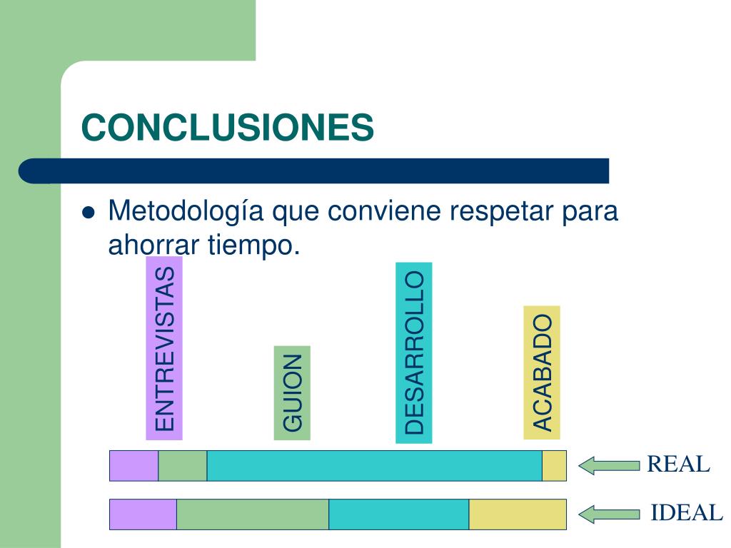 CONCLUSIONES • Metodología que conviene respetar para ahorrar tiempo. ENTREVISTAS DESARROLLO ACABADO GUION REAL IDEAL