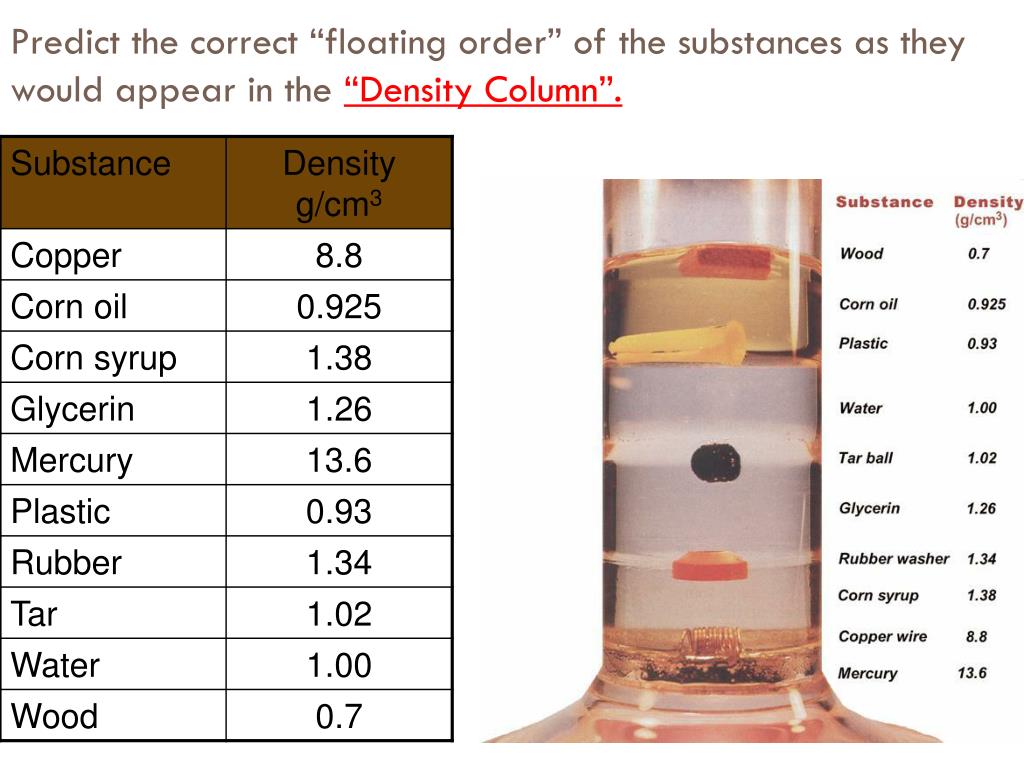 Predict the correct “floating order” of the substances as they would appear in the “Density Column”.