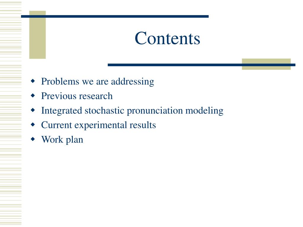 Contents • Problems we are addressing • Previous research • Integrated stochastic pronunciation modeling • Current experimental results • Work plan
