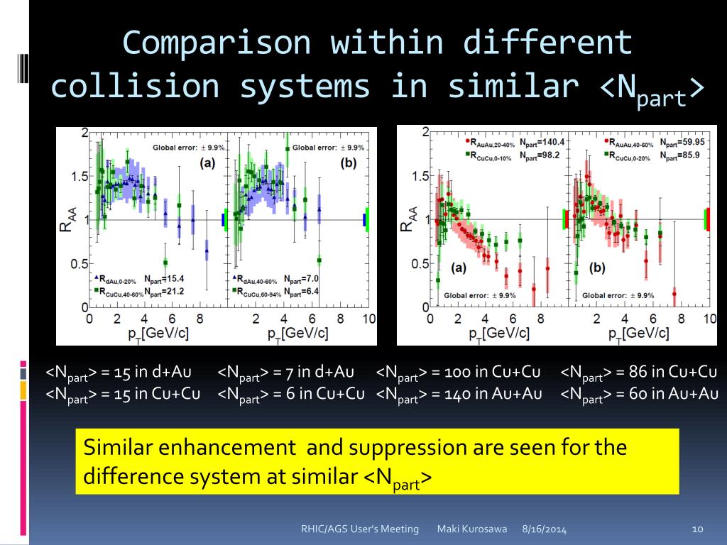 Comparison within different collision systems in similar <Npart> <Npart> = 15 in d+Au <Npart> = 15 in Cu+Cu <Npart> = 7 in d+Au <Npart> = 6 in Cu+Cu <Npart> = 100 in Cu+Cu <Npart> = 140 in Au+Au <Npart> = 86 in Cu+Cu <Npart> = 60 in Au+Au Similar enhancement and suppression are seen for the difference system at similar <Npart> RHIC/AGS User's Meeting Maki Kurosawa