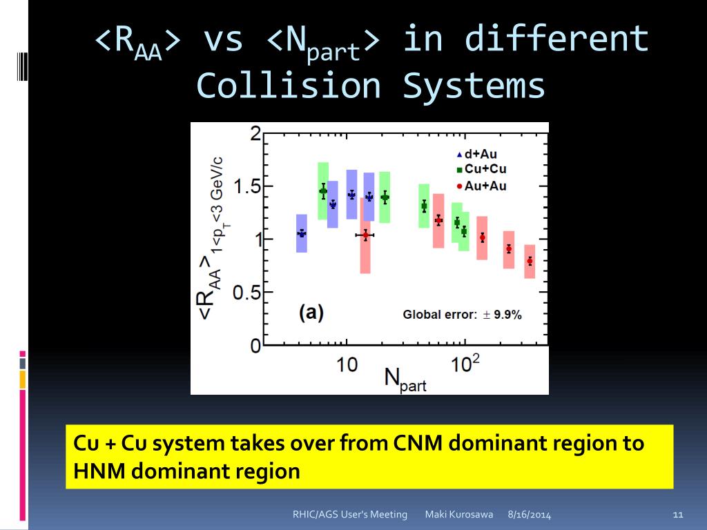 <RAA> vs <Npart> in different Collision Systems Cu + Cu system takes over from CNM dominant region to HNM dominant region RHIC/AGS User's Meeting Maki Kurosawa