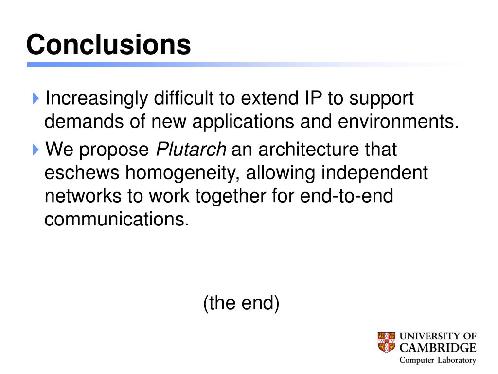Conclusions • Increasingly difficult to extend IP to support demands of new applications and environments. • We propose Plutarch an architecture that eschews homogeneity, allowing independent networks to work together for end-to-end communications. (the end)