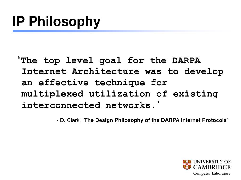 IP Philosophy “The top level goal for the DARPA Internet Architecture was to develop an effective technique for multiplexed utilization of existing interconnected networks.” - D. Clark, “The Design Philosophy of the DARPA Internet Protocols”