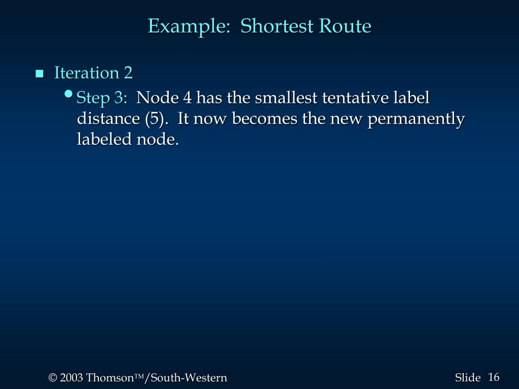 Example: Shortest Route • Iteration 2 • Step 4:For each node with a tentative label which is connected to node 4 by just one arc, compute the sum of its arc length plus the distance value of node 4 (which is 5). Node 3: 1 + 5 = 6 (replace the tentative label of node 3 by (6,4) since 6 < 7, the current distance.) Node 6: 8 + 5 = 13 (assign tentative label to node 6 of (13,4) since node 6 had no label.)