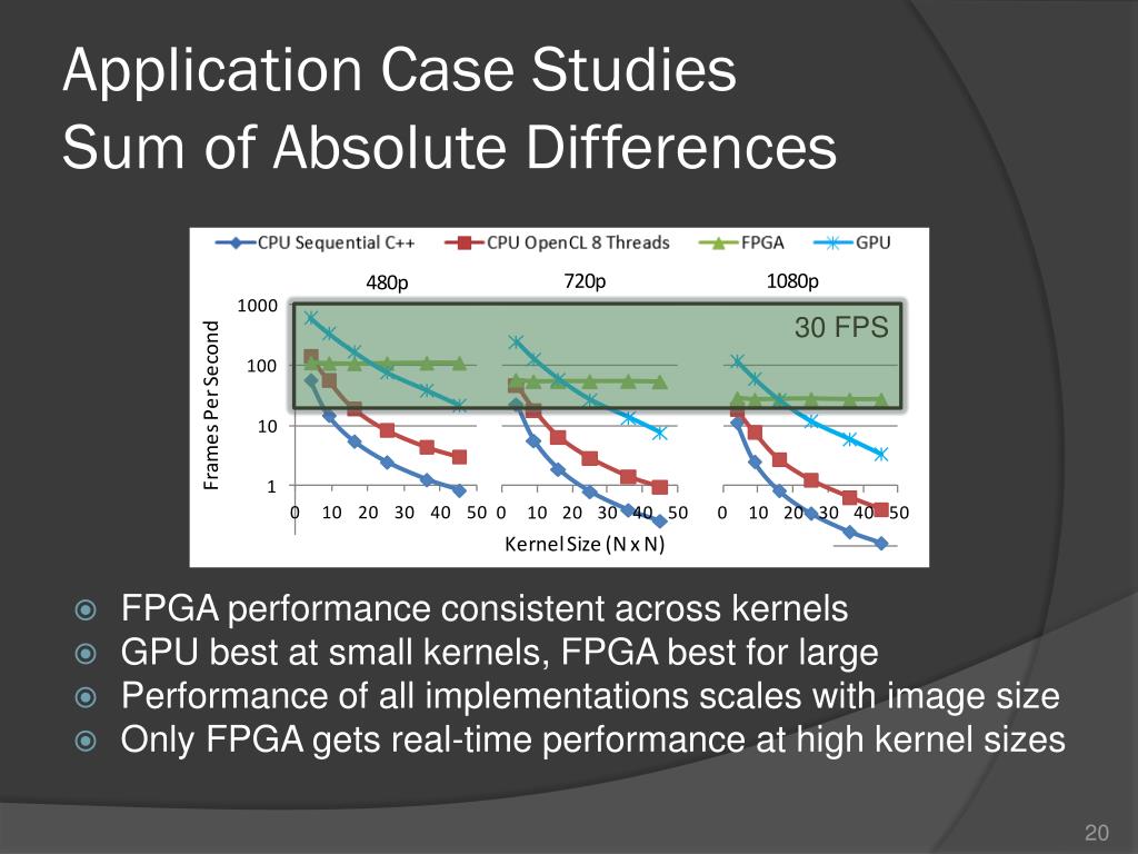 Application Case StudiesSum of Absolute Differences • FPGA performance consistent across kernels • GPU best at small kernels, FPGA best for large • Performance of all implementations scales with image size • Only FPGA gets real-time performance at high kernel sizes 30 FPS