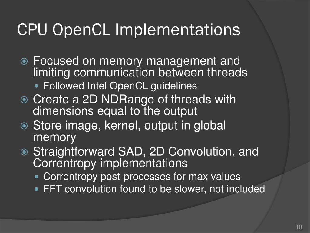 CPU OpenCL Implementations • Focused on memory management and limiting communication between threads • Followed Intel OpenCL guidelines • Create a 2D NDRange of threads with dimensions equal to the output • Store image, kernel, output in global memory • Straightforward SAD, 2D Convolution, and Correntropy implementations • Correntropy post-processes for max values • FFT convolution found to be slower, not included
