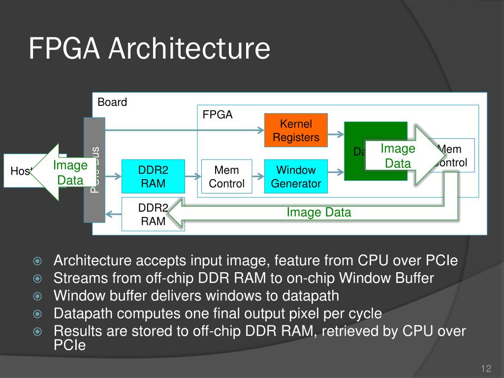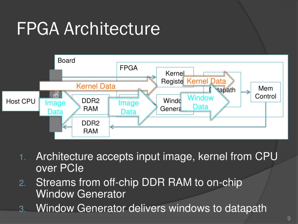FPGA Architecture • Architecture accepts input image, kernel from CPU over PCIe • Streams from off-chip DDR RAM to on-chip Window Generator • Window Generator delivers windows to datapath Board FPGA Kernel Registers PCIe Bus Kernel Data Datapath Kernel Data Mem Control Window Data Image Data Image Data Host CPU DDR2 RAM Mem Control Window Generator DDR2 RAM