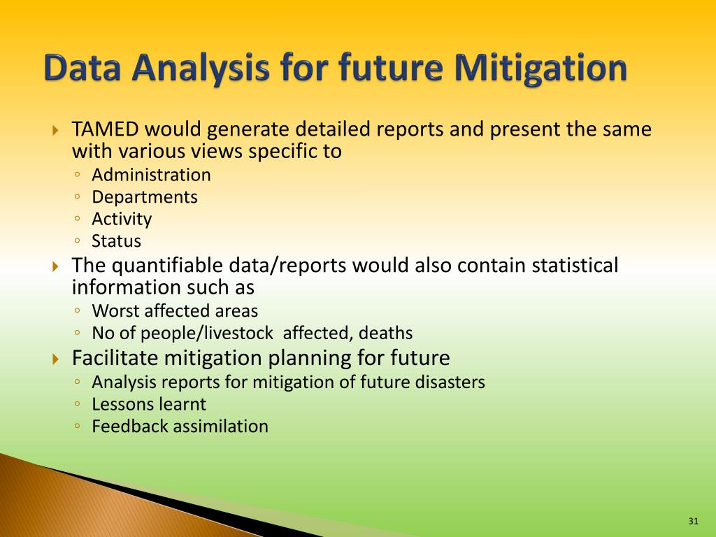 Data Analysis for future Mitigation • TAMED would generate detailed reports and present the same with various views specific to • Administration • Departments • Activity • Status • The quantifiable data/reports would also contain statistical information such as • Worst affected areas • No of people/livestock affected, deaths • Facilitate mitigation planning for future • Analysis reports for mitigation of future disasters • Lessons learnt • Feedback assimilation