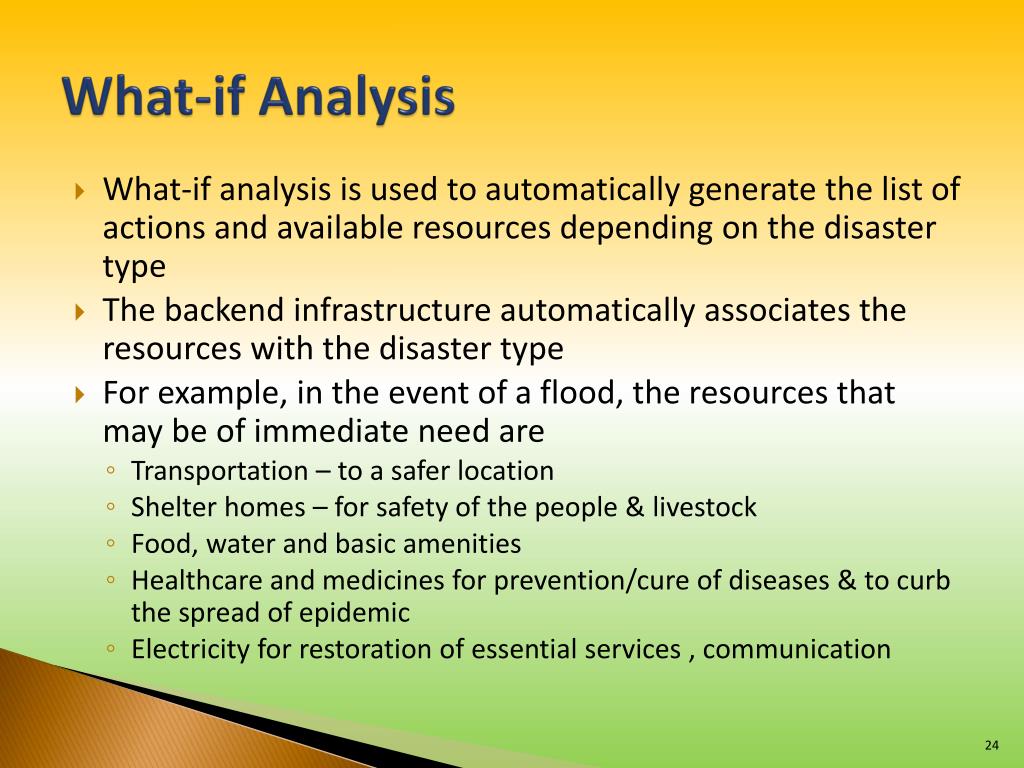 What-if Analysis Transportation Shelter Healthcare & medicines Disaster (Flood) Fodder Food & water Electricity