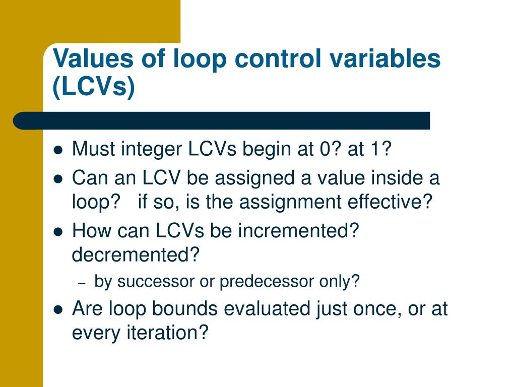 Values of loop control variables (LCVs) • Must integer LCVs begin at 0? at 1? • Can an LCV be assigned a value inside a loop? if so, is the assignment effective? • How can LCVs be incremented? decremented? • by successor or predecessor only? • Are loop bounds evaluated just once, or at every iteration?
