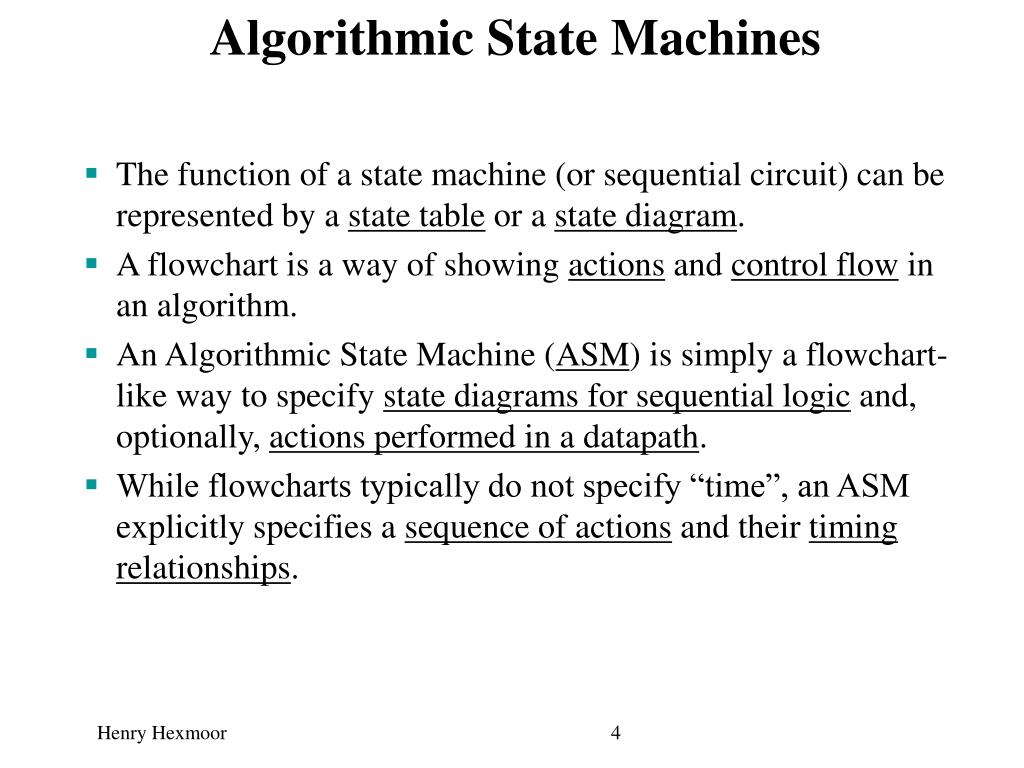 The function of a state machine (or sequential circuit) can be represented by a state table or a state diagram. A flowchart is a way of showing actions and control flow in an algorithm. An Algorithmic State Machine (ASM) is simply a flowchart-like way to specify state diagrams for sequential logic and, optionally, actions performed in a datapath. While flowcharts typically do not specify “time”, an ASM explicitly specifies a sequence of actions and their timing relationships. Algorithmic State Machines Henry Hexmoor