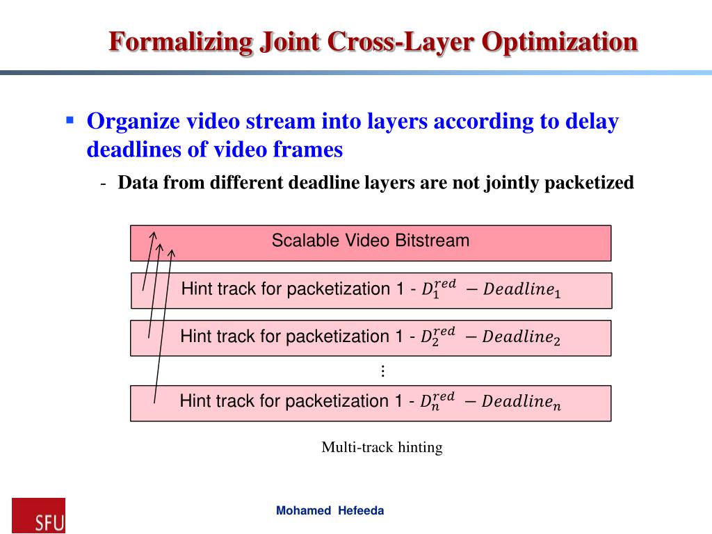 Formalizing Joint Cross-Layer Optimization • Organize video stream into layers according to delay deadlines of video frames • Data from different deadline layers are not jointly packetized Scalable Video Bitstream Hint track for packetization 1 - Hint track for packetization 1 - Hint track for packetization 1 - Multi-track hinting