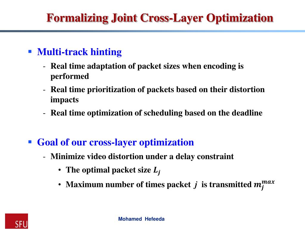 Formalizing Joint Cross-Layer Optimization • Multi-track hinting • Real time adaptation of packet sizes when encoding is performed • Real time prioritization of packets based on their distortion impacts • Real time optimization of scheduling based on the deadline • Goal of our cross-layer optimization • Minimize video distortion under a delay constraint • The optimal packet size • Maximum number of times packet j is transmitted