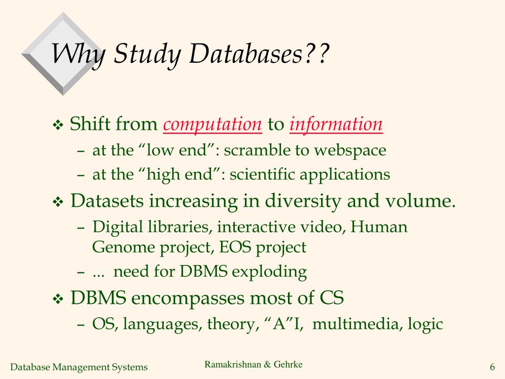 Why Study Databases?? • Shift from computation to information • at the “low end”: scramble to webspace • at the “high end”: scientific applications • Datasets increasing in diversity and volume. • Digital libraries, interactive video, Human Genome project, EOS project • ... need for DBMS exploding • DBMS encompasses most of CS • OS, languages, theory, “A”I, multimedia, logic Ramakrishnan & Gehrke
