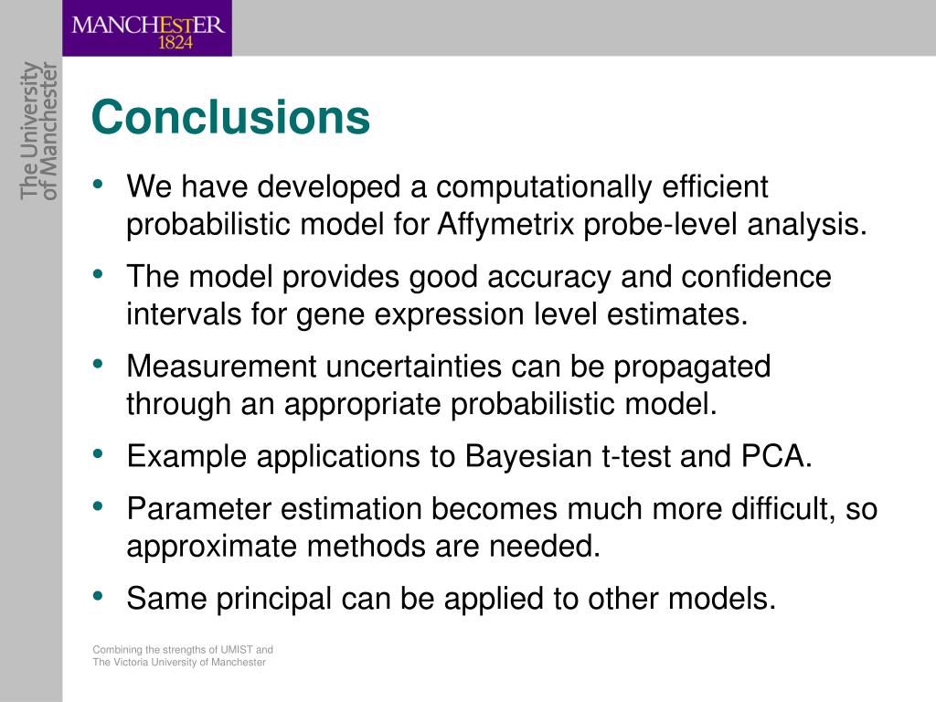 Conclusions • We have developed a computationally efficient probabilistic model for Affymetrix probe-level analysis. • The model provides good accuracy and confidence intervals for gene expression level estimates. • Measurement uncertainties can be propagated through an appropriate probabilistic model. • Example applications to Bayesian t-test and PCA. • Parameter estimation becomes much more difficult, so approximate methods are needed. • Same principal can be applied to other models.