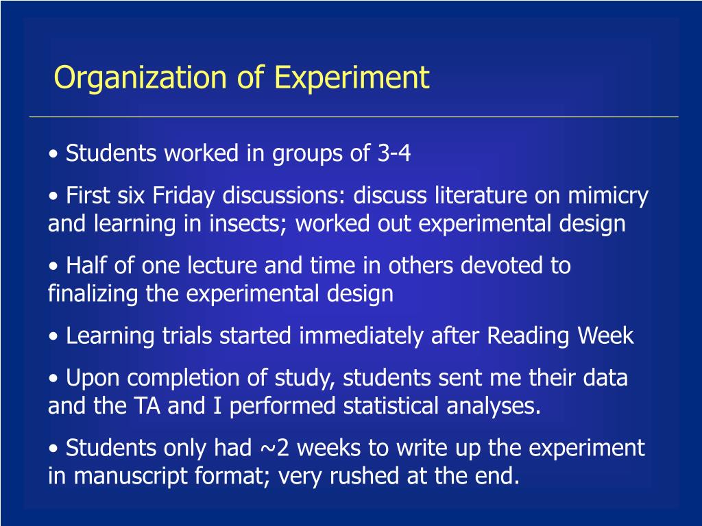 Organization of Experiment • Students worked in groups of 3-4 • First six Friday discussions: discuss literature on mimicry and learning in insects; worked out experimental design • Half of one lecture and time in others devoted to finalizing the experimental design • Learning trials started immediately after Reading Week • Upon completion of study, students sent me their data and the TA and I performed statistical analyses. • Students only had ~2 weeks to write up the experiment in manuscript format; very rushed at the end.