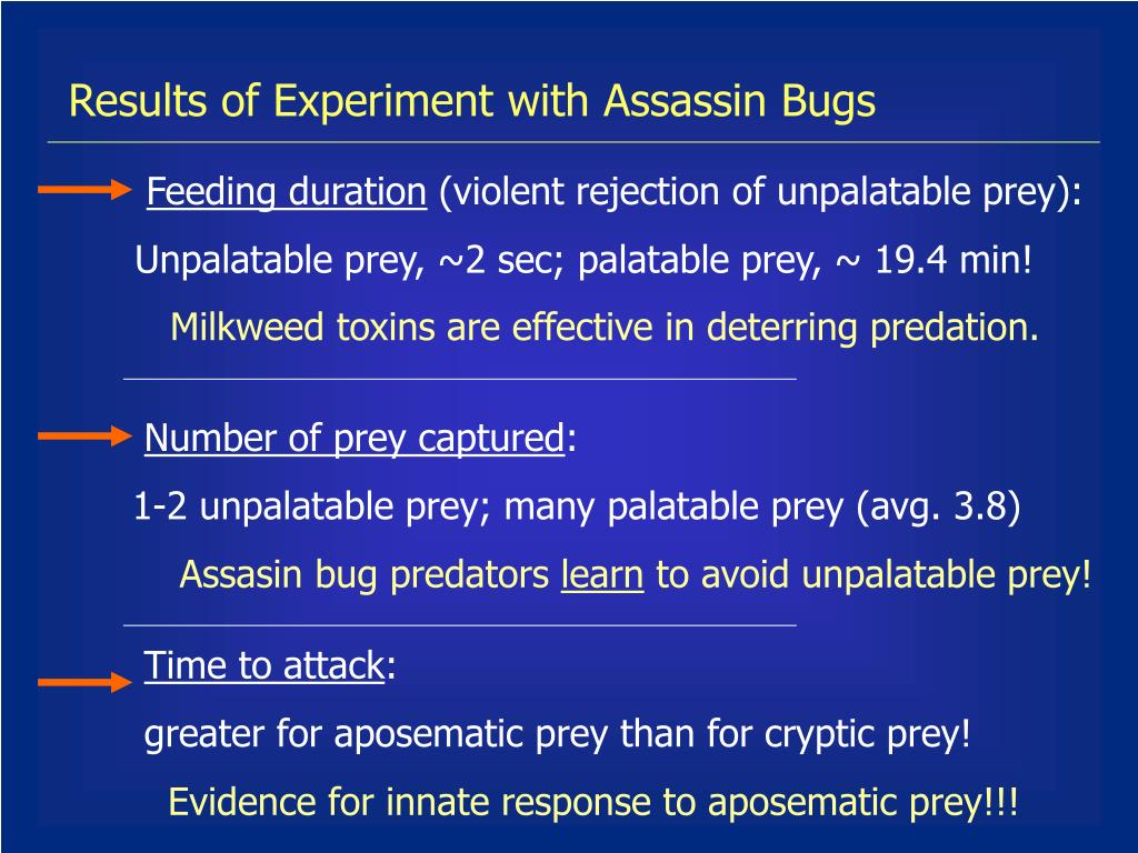 2002: Learning by Assassin Bug Predators of Unpalatable Aposematic Insects The Predator: Platymeris bigutatta, large African assassin bug (Toronto Zoo) The Prey: Oncopeltus fasciatus, the milkweed bug (commercial sunflower-feeding strain)
