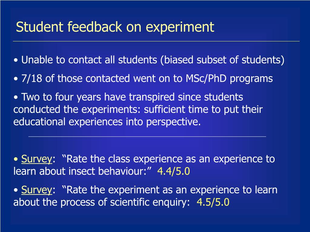 Student feedback on experiment • Unable to contact all students (biased subset of students) • 7/18 of those contacted went on to MSc/PhD programs • Two to four years have transpired since students conducted the experiments: sufficient time to put their educational experiences into perspective. • Survey: “Rate the class experience as an experience to learn about insect behaviour:” 4.4/5.0 • Survey: “Rate the experiment as an experience to learn about the process of scientific enquiry: 4.5/5.0