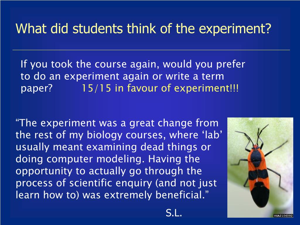 What did students think of the experiment? If you took the course again, would you prefer to do an experiment again or write a term paper? 15/15 in favour of experiment!!! “The experiment was a great change from the rest of my biology courses, where ‘lab’ usually meant examining dead things or doing computer modeling. Having the opportunity to actually go through the process of scientific enquiry (and not just learn how to) was extremely beneficial.” S.L.
