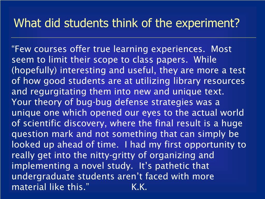 What did students think of the experiment? “Few courses offer true learning experiences. Most seem to limit their scope to class papers. While (hopefully) interesting and useful, they are more a test of how good students are at utilizing library resources and regurgitating them into new and unique text. Your theory of bug-bug defense strategies was a unique one which opened our eyes to the actual world of scientific discovery, where the final result is a huge question mark and not something that can simply be looked up ahead of time. I had my first opportunity to really get into the nitty-gritty of organizing and implementing a novel study. It’s pathetic that undergraduate students aren’t faced with more material like this.” K.K.