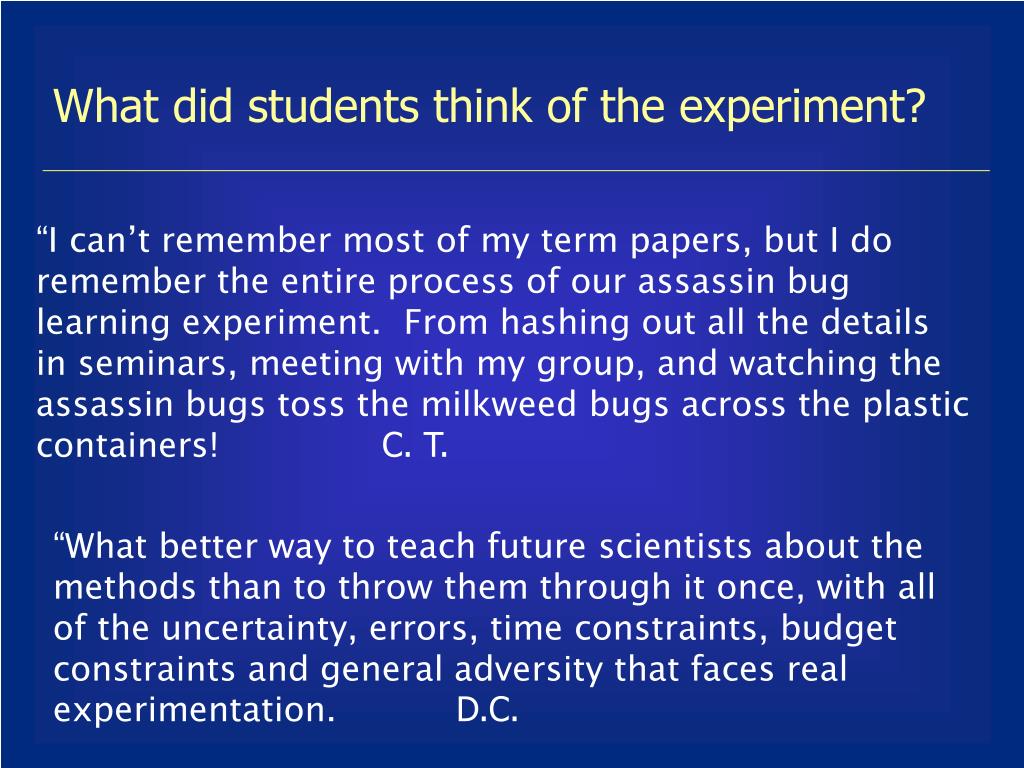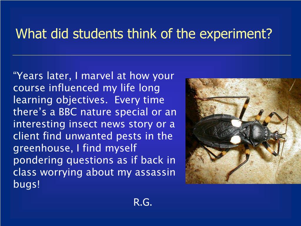 What did students think of the experiment? “I can’t remember most of my term papers, but I do remember the entire process of our assassin bug learning experiment. From hashing out all the details in seminars, meeting with my group, and watching the assassin bugs toss the milkweed bugs across the plastic containers! C. T. “What better way to teach future scientists about the methods than to throw them through it once, with all of the uncertainty, errors, time constraints, budget constraints and general adversity that faces real experimentation. D.C.