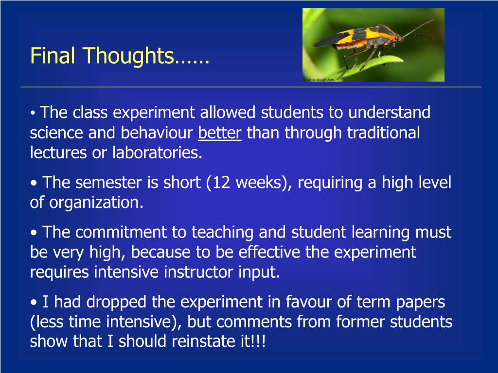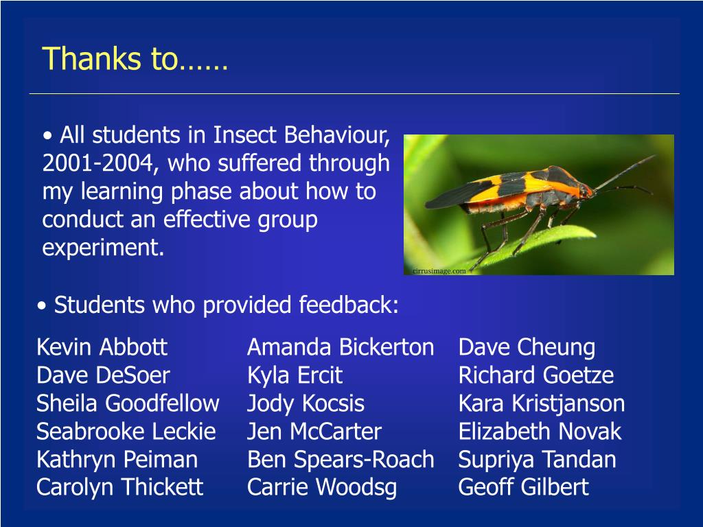 Thanks to…… • All students in Insect Behaviour, 2001-2004, who suffered through my learning phase about how to conduct an effective group experiment. • Students who provided feedback: • Kevin Abbott Amanda Bickerton Dave Cheung Dave DeSoer Kyla Ercit Richard Goetze Sheila Goodfellow Jody Kocsis Kara Kristjanson Seabrooke Leckie Jen McCarter Elizabeth Novak Kathryn Peiman Ben Spears-Roach Supriya Tandan Carolyn Thickett Carrie Woodsg Geoff Gilbert