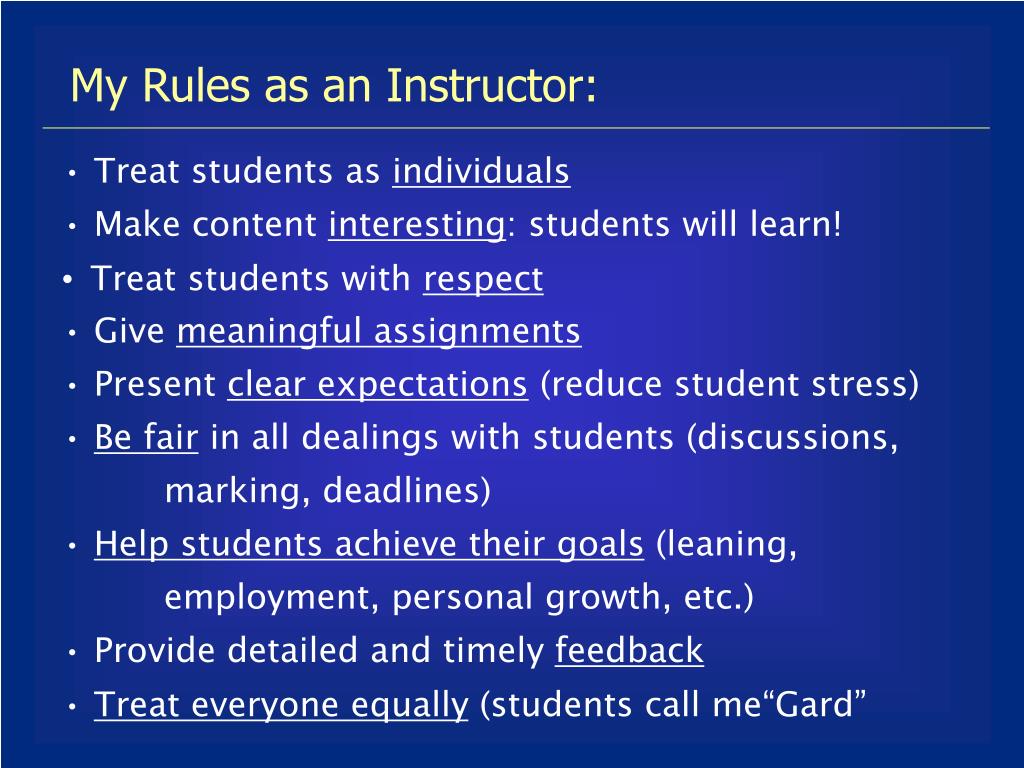 My Rules as an Instructor: • Treat students as individuals • Make content interesting: students will learn! • Treat students with respect • Give meaningful assignments • Present clear expectations (reduce student stress) • Be fair in all dealings with students (discussions, • marking, deadlines) • Help students achieve their goals (leaning, • employment, personal growth, etc.) • Provide detailed and timely feedback • Treat everyone equally (students call me“Gard”