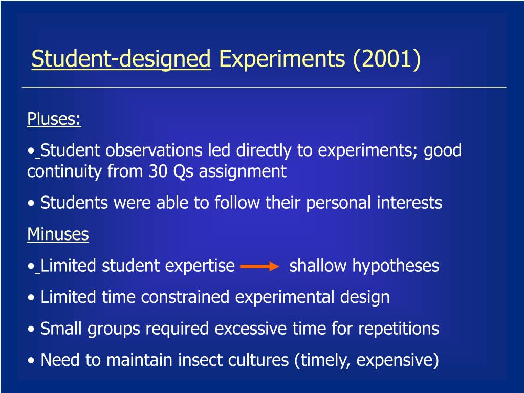 Student-designed Experiments (2001) • Pluses: • Student observations led directly to experiments; good continuity from 30 Qs assignment • Students were able to follow their personal interests • Minuses • Limited student expertise shallow hypotheses • Limited time constrained experimental design • Small groups required excessive time for repetitions • Need to maintain insect cultures (timely, expensive)