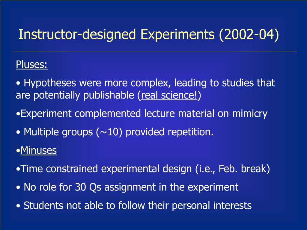 Instructor-designed Experiments (2002-04) • Pluses: • Hypotheses were more complex, leading to studies that are potentially publishable (real science!) • Experiment complemented lecture material on mimicry • Multiple groups (~10) provided repetition. • Minuses • Time constrained experimental design (i.e., Feb. break) • No role for 30 Qs assignment in the experiment • Students not able to follow their personal interests