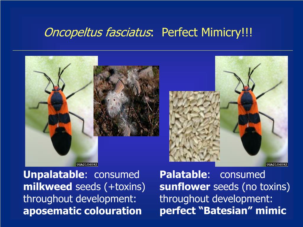 Oncopeltus fasciatus: Perfect Mimicry!!! Unpalatable: consumed milkweed seeds (+toxins) throughout development: aposematic colouration Palatable: consumed sunflower seeds (no toxins) throughout development: perfect “Batesian” mimic