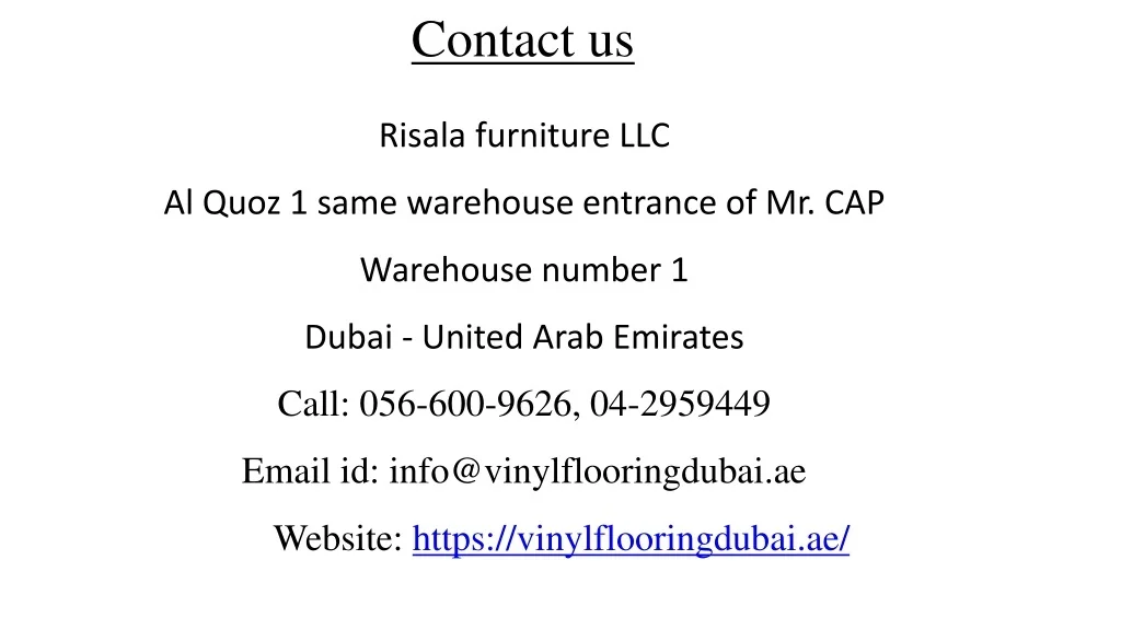 Risala furniture LLCAl Quoz 1 same warehouse entrance of Mr. CAPWarehouse number 1Dubai - United Arab Emirates Call: 056-600-9626, 04-2959449 Email id: info@vinylflooringdubai.ae Website: https://vinylflooringdubai.ae/ Contact us