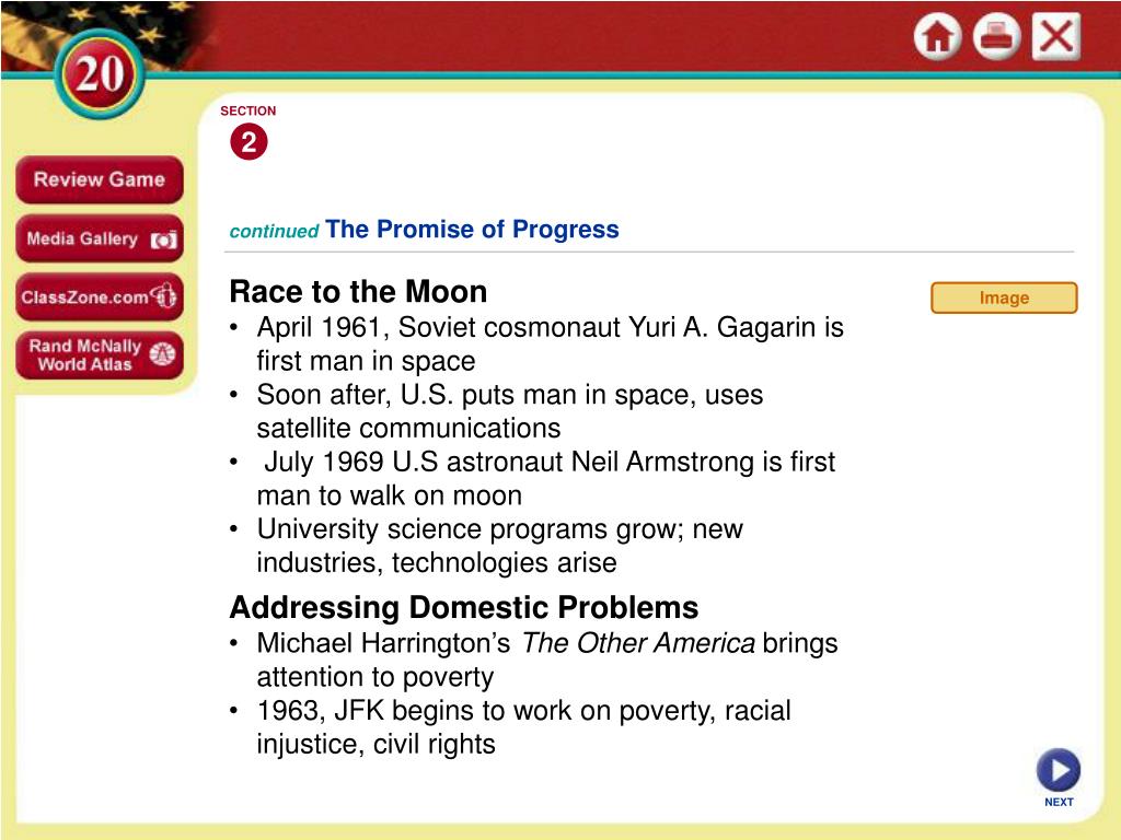 SECTION 2 Image continuedThe Promise of Progress • Race to the Moon • April 1961, Soviet cosmonaut Yuri A. Gagarin is first man in space • Soon after, U.S. puts man in space, uses satellite communications • July 1969 U.S astronaut Neil Armstrong is first man to walk on moon • University science programs grow; new industries, technologies arise • Addressing Domestic Problems • Michael Harrington’s The Other America brings attention to poverty • 1963, JFK begins to work on poverty, racial injustice, civil rights NEXT
