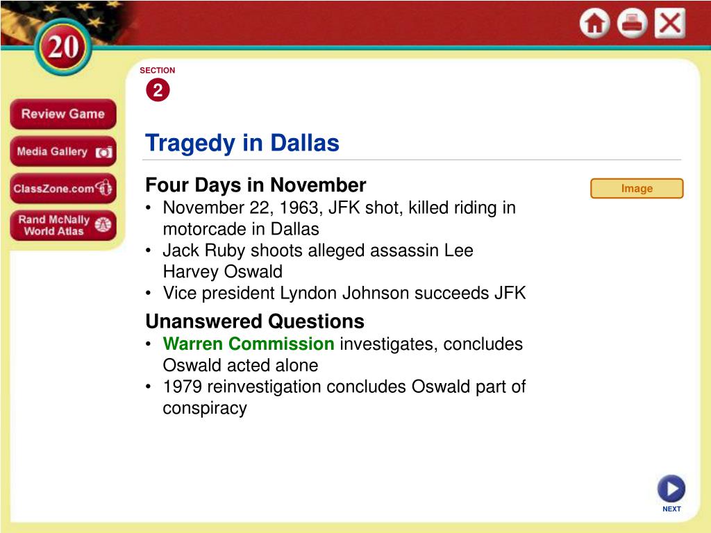 SECTION 2 Image Tragedy in Dallas • Four Days in November • November 22, 1963, JFK shot, killed riding in motorcade in Dallas • Jack Ruby shoots alleged assassin Lee Harvey Oswald • Vice president Lyndon Johnson succeeds JFK • Unanswered Questions • • Warren Commission investigates, concludes Oswald acted alone • 1979 reinvestigation concludes Oswald part of conspiracy NEXT