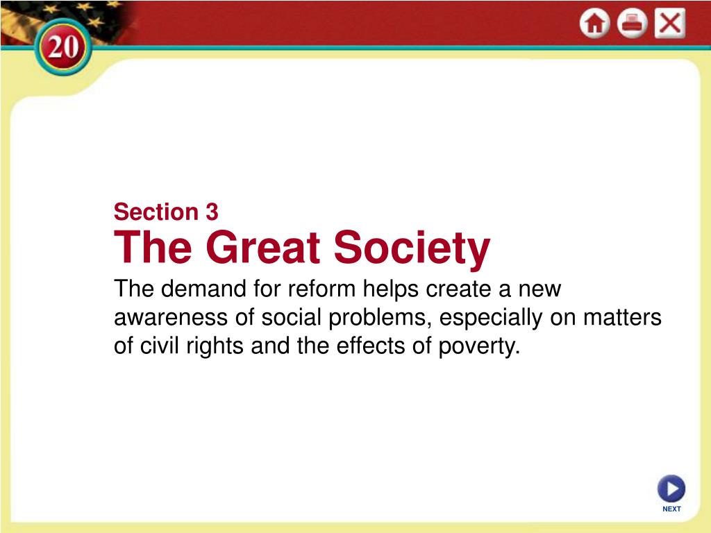 Section 3 The Great Society The demand for reform helps create a new awareness of social problems, especially on matters of civil rights and the effects of poverty. NEXT