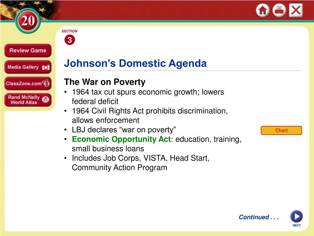 SECTION 3 Chart Johnson’s Domestic Agenda • The War on Poverty • 1964 tax cut spurs economic growth; lowers federal deficit • 1964 Civil Rights Act prohibits discrimination, allows enforcement • LBJ declares “war on poverty” • • Economic Opportunity Act: education, training, small business loans • Includes Job Corps, VISTA, Head Start, Community Action Program Continued . . . NEXT