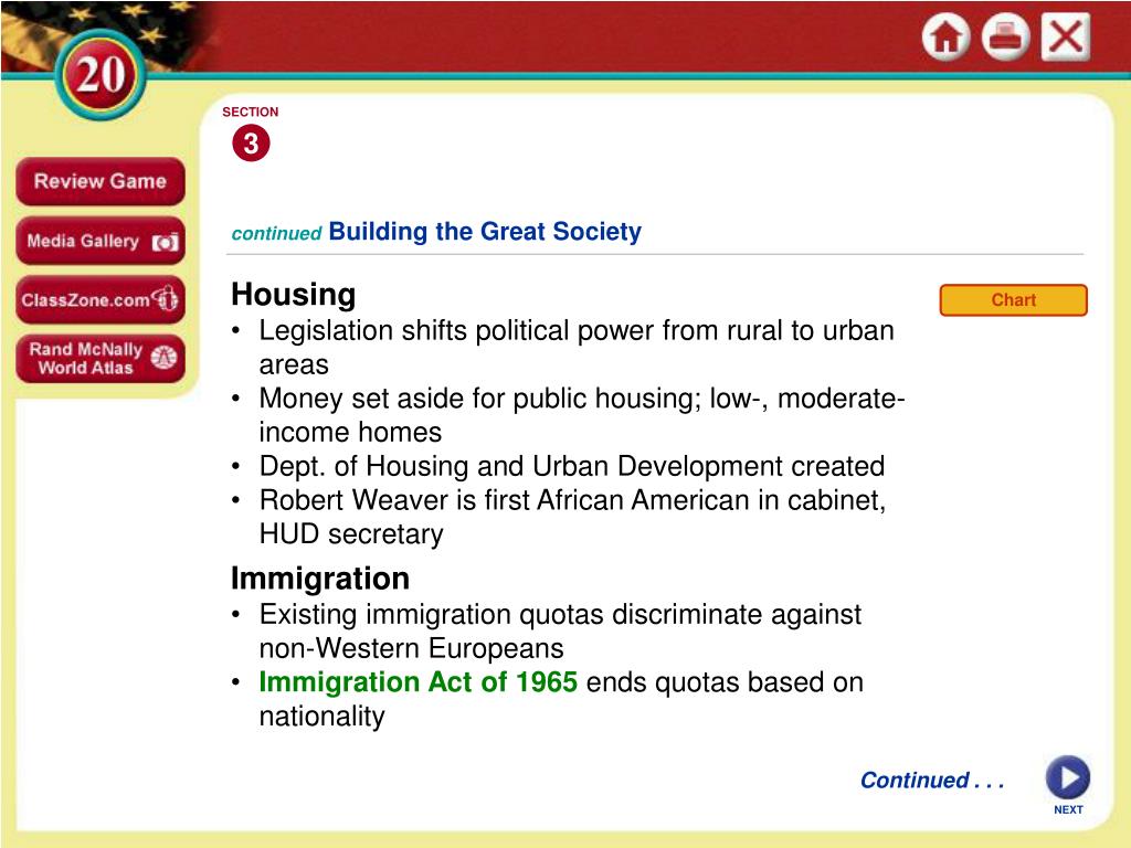 SECTION 3 Chart continuedBuilding the Great Society • Housing • Legislation shifts political power from rural to urban areas • Money set aside for public housing; low-, moderate-income homes • Dept. of Housing and Urban Development created • Robert Weaver is first African American in cabinet, HUD secretary • Immigration • Existing immigration quotas discriminate against non-Western Europeans • • Immigration Act of 1965 ends quotas based on nationality Continued . . . NEXT