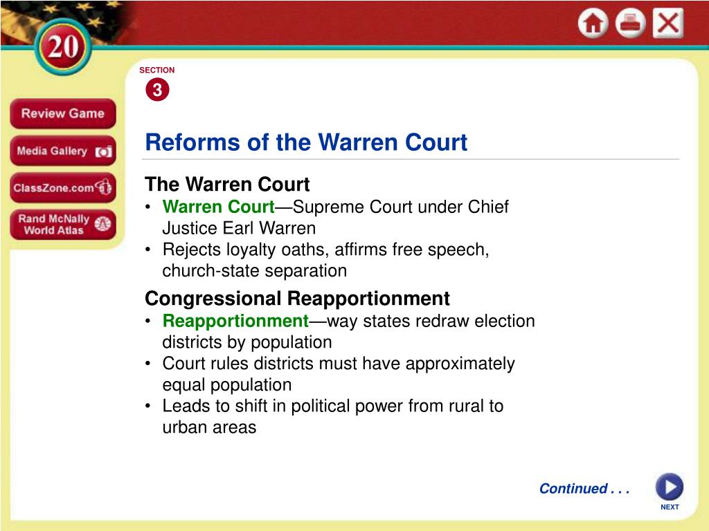 SECTION 3 Reforms of the Warren Court The Warren Court • Warren Court—Supreme Court under Chief Justice Earl Warren • Rejects loyalty oaths, affirms free speech, church-state separation • Congressional Reapportionment • • Reapportionment—way states redraw election districts by population • Court rules districts must have approximately equal population • Leads to shift in political power from rural to urban areas Continued . . . NEXT