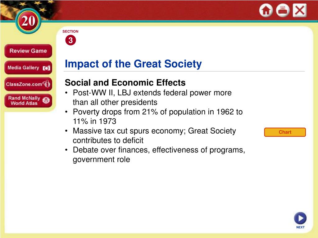 SECTION 3 Chart Impact of the Great Society • Social and Economic Effects • Post-WW II, LBJ extends federal power more than all other presidents • Poverty drops from 21% of population in 1962 to 11% in 1973 • Massive tax cut spurs economy; Great Society contributes to deficit • Debate over finances, effectiveness of programs, government role NEXT