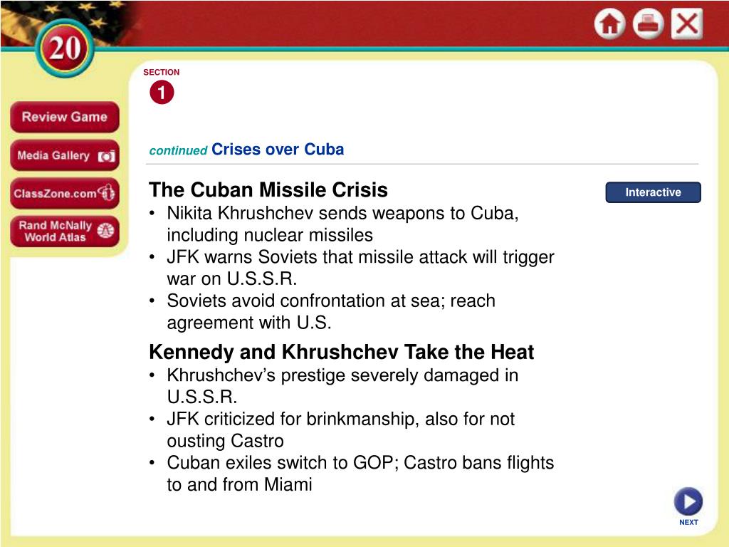 SECTION 1 Interactive continuedCrises over Cuba • The Cuban Missile Crisis • Nikita Khrushchev sends weapons to Cuba, including nuclear missiles • JFK warns Soviets that missile attack will trigger war on U.S.S.R. • Soviets avoid confrontation at sea; reach agreement with U.S. • Kennedy and Khrushchev Take the Heat • Khrushchev’s prestige severely damaged in U.S.S.R. • JFK criticized for brinkmanship, also for not ousting Castro • Cuban exiles switch to GOP; Castro bans flights to and from Miami NEXT