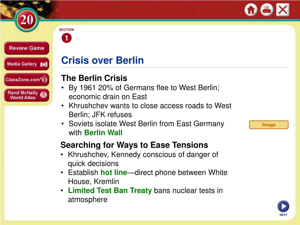 SECTION 1 Image Crisis over Berlin • The Berlin Crisis • By 1961 20% of Germans flee to West Berlin; economic drain on East • Khrushchev wants to close access roads to West Berlin; JFK refuses • Soviets isolate West Berlin from East Germany with Berlin Wall • Searching for Ways to Ease Tensions • Khrushchev, Kennedy conscious of danger of quick decisions • Establish hot line—direct phone between White House, Kremlin • • Limited Test Ban Treaty bans nuclear tests in atmosphere NEXT