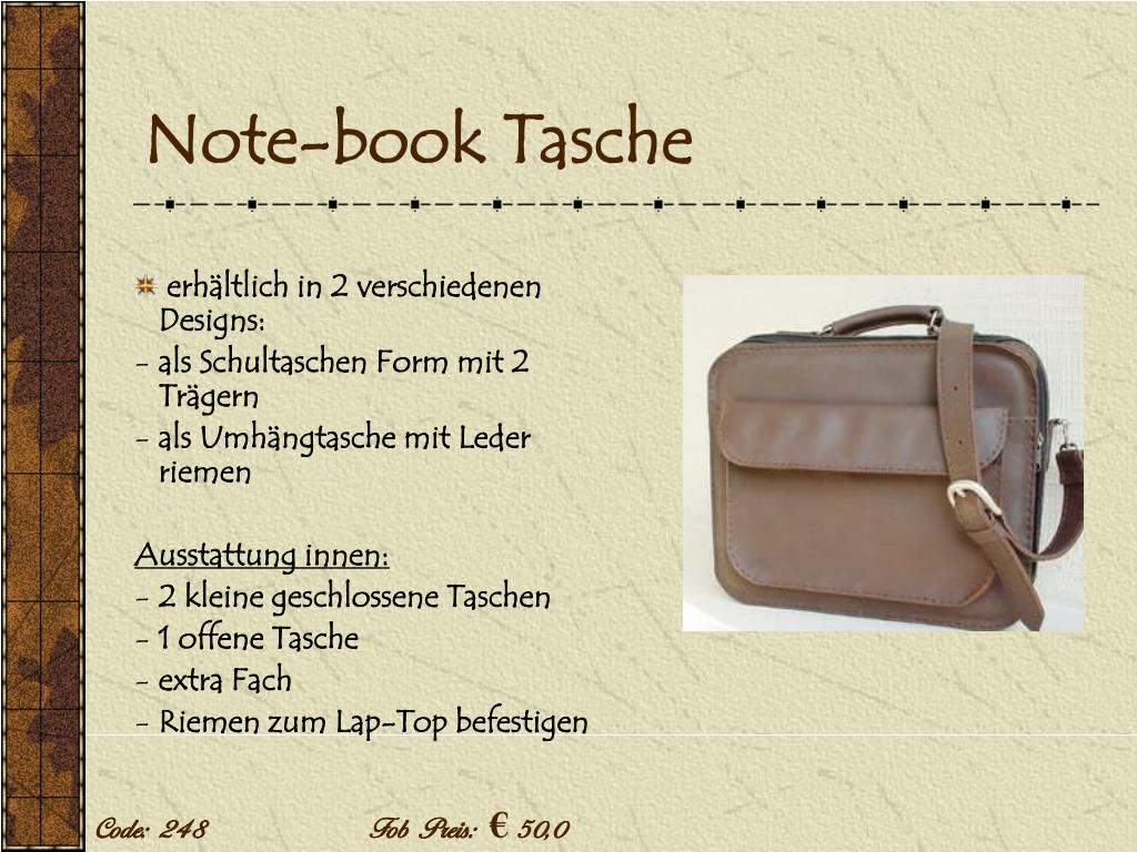 Note-book Tasche • erhältlich in 2 verschiedenen Designs: • als Schultaschen Form mit 2 Trägern • als Umhängtasche mit Leder riemen Ausstattung innen: • 2 kleine geschlossene Taschen • 1 offene Tasche • extra Fach • Riemen zum Lap-Top befestigen Code: 248 Fob Preis: €50,0